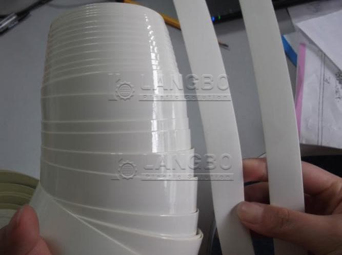 the edge band will be submerged in the water tank after out of extrusion mold, an effective cooling and suitable hauling speed determin the final witdh and thickness of the edge band.
