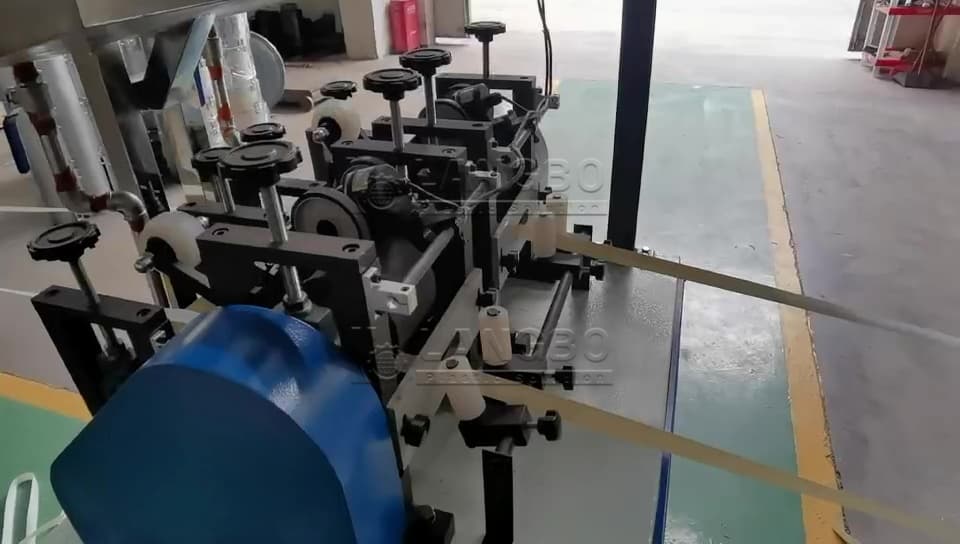 the edge band will be submerged in the water tank after out of extrusion mold, an effective cooling and suitable hauling speed determin the final witdh and thickness of the edge band.